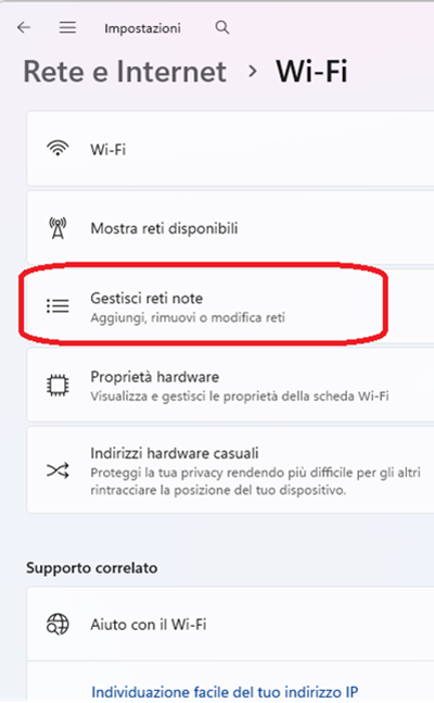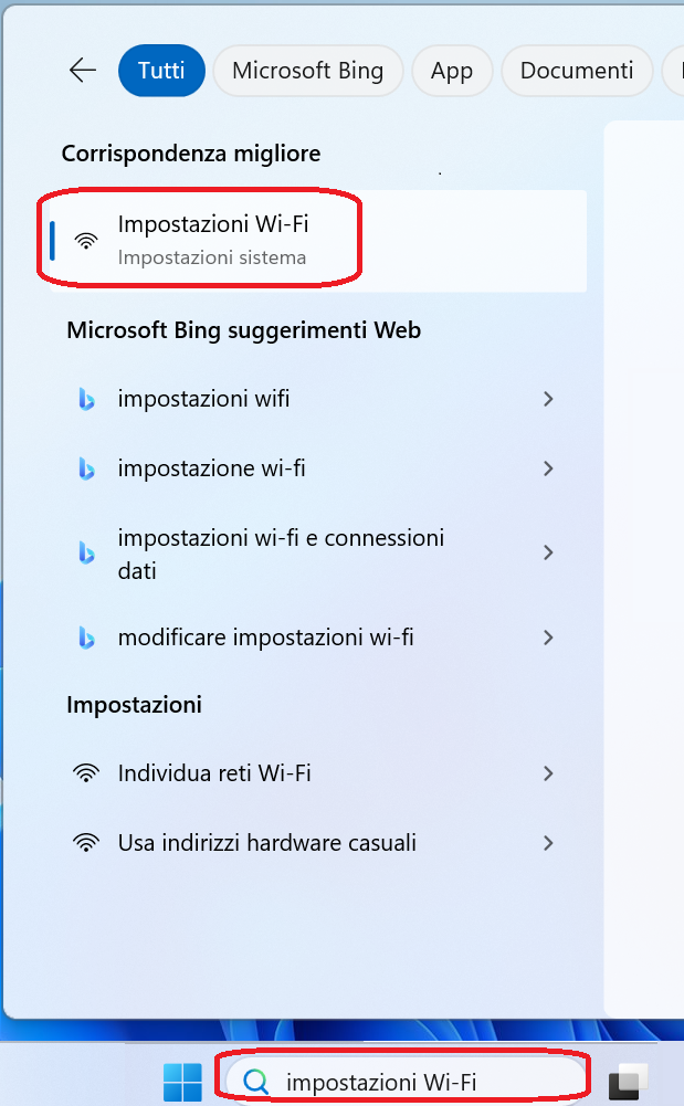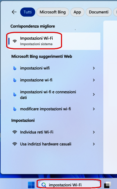 - Nel menu "Cerca" o "Start" (icona di Windows) inserisci -> "Impostatzioni Wi-Fi".