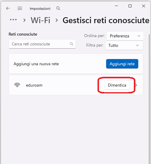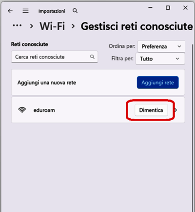 - Seleziona le reti eduroam e clicca su "Diemntica".
