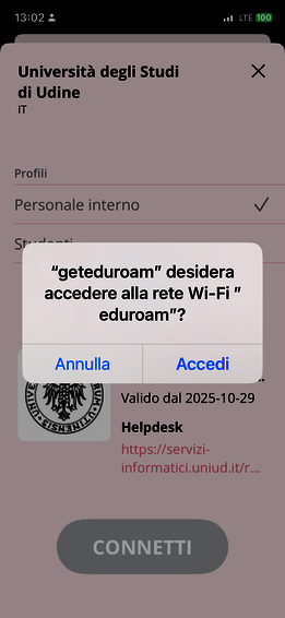 - Clicca su "Accedi" alla richiesta "geteduroam" desidera accedere alla rete Wi-Fi eduroam?